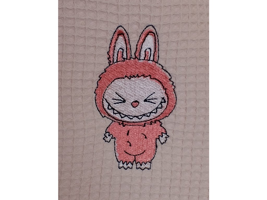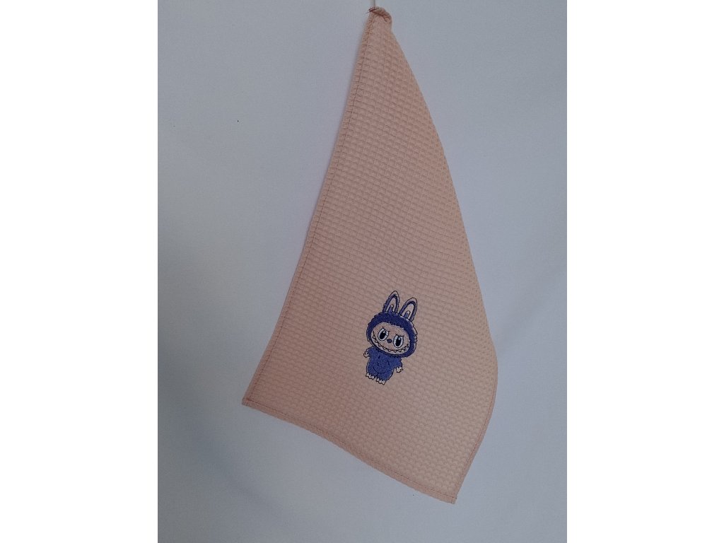 Dominantným prvkom je motív Labubu – ikonickej postavičky s veľkými očami a typickým širokým úsmevom. Na každom uteráčiku je zobrazený iným spôsobom: niekde Labubu stojí s roztiahnutými rúčkami, akoby vítal malé detské ručičky, inde sa smeje s iskrou hravosti v očiach, a na ďalšom drží malý symbol – kvetinku, hviezdičku alebo srdiečko. Motívy sú potlačené alebo jemne vyšité kontrastnými farbami, takže vynikajú na štruktúrovanom povrchu vafloviny.