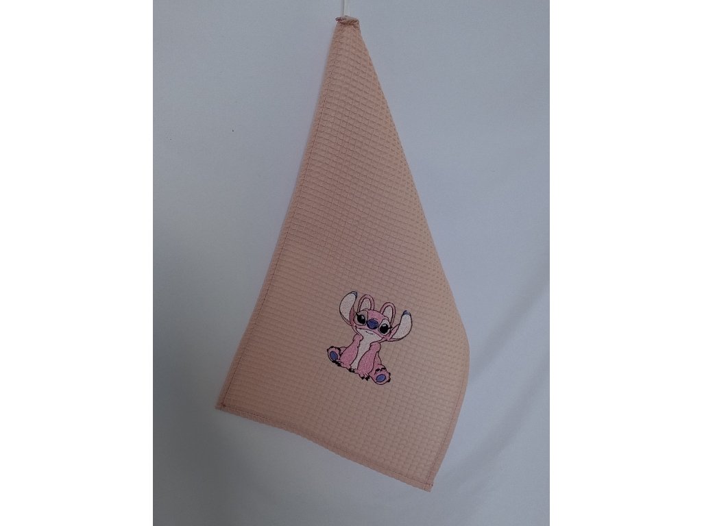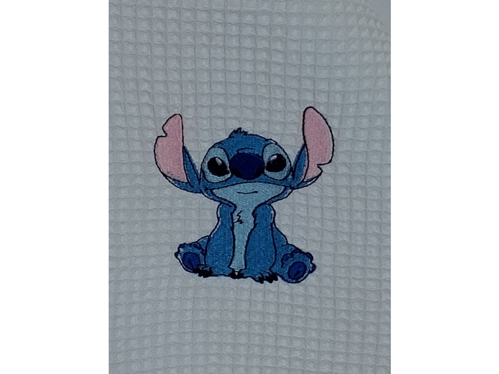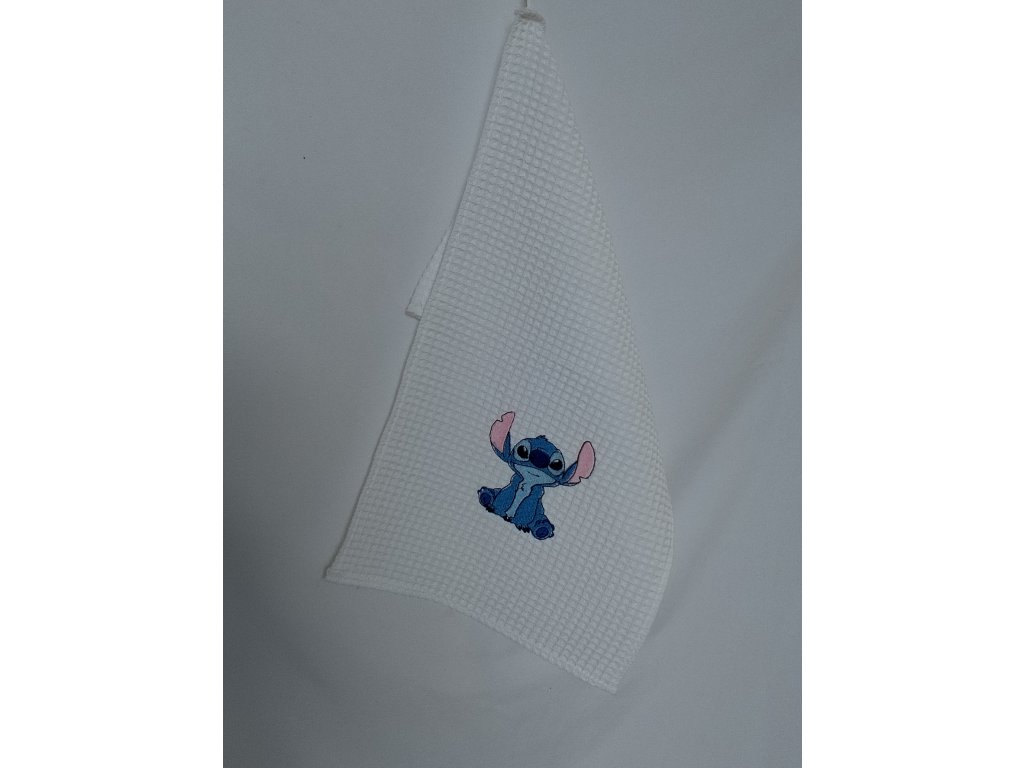 Dominantou uteráčika je vyšité zvieratko či postavička. Ak je na ňom Stitch, vyšívanie zachytáva jeho typický veselý a trochu uletený výraz – veľké guľaté oči, široký úsmev a roztomilé labky, ktoré akoby sa chceli natiahnuť k dieťaťu. Stitch je vyšité v odtieňoch modrej, s detailami v tmavších tónoch, ktoré krásne vystupujú na jemnom podklade. Vyzerá, akoby práve vyskočil z animovanej rozprávky priamo na uteráčik.