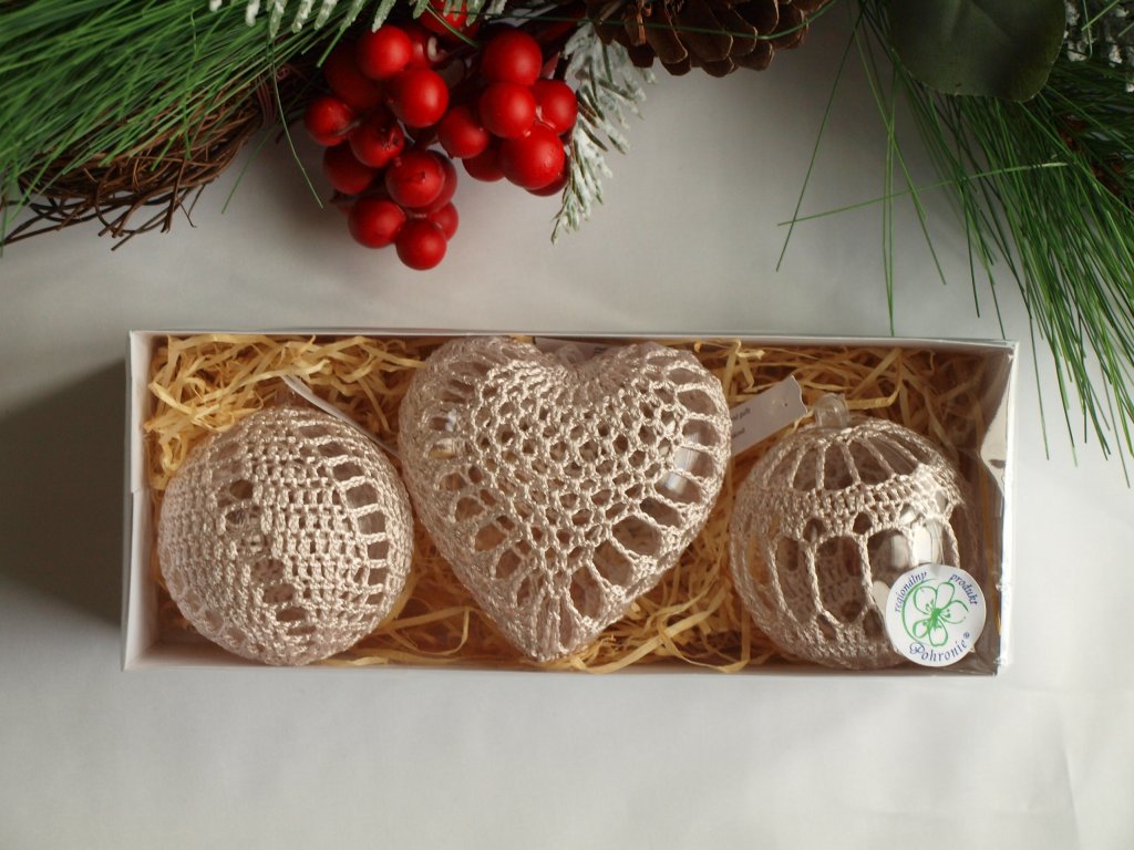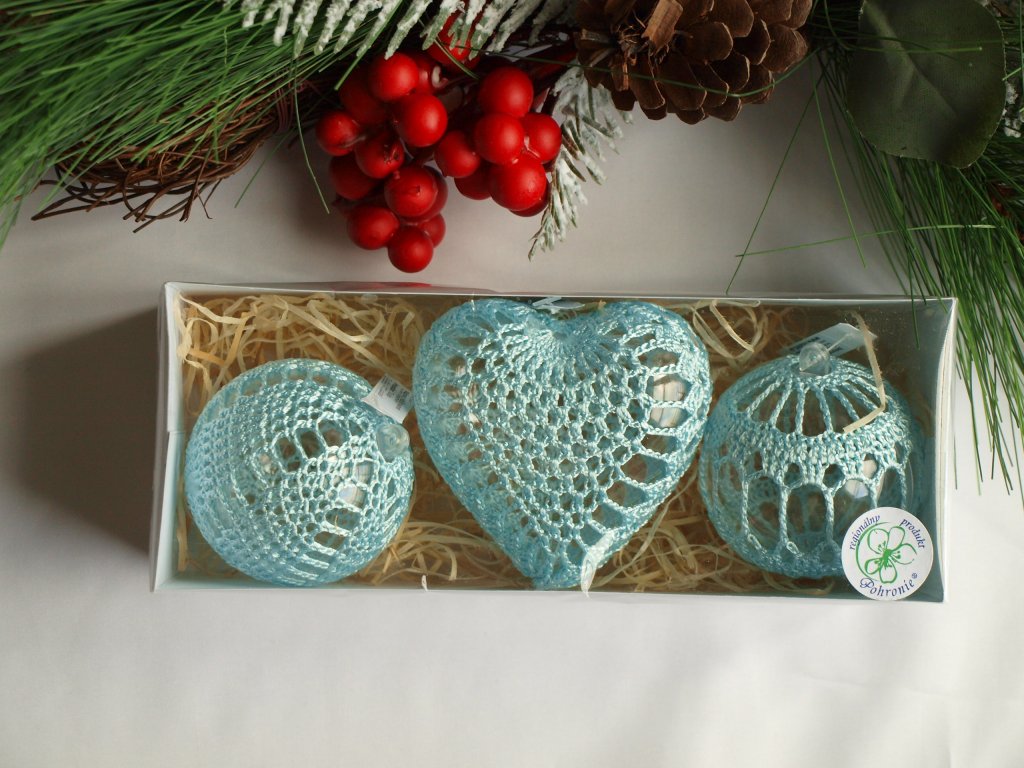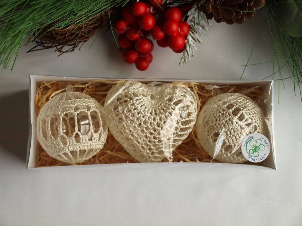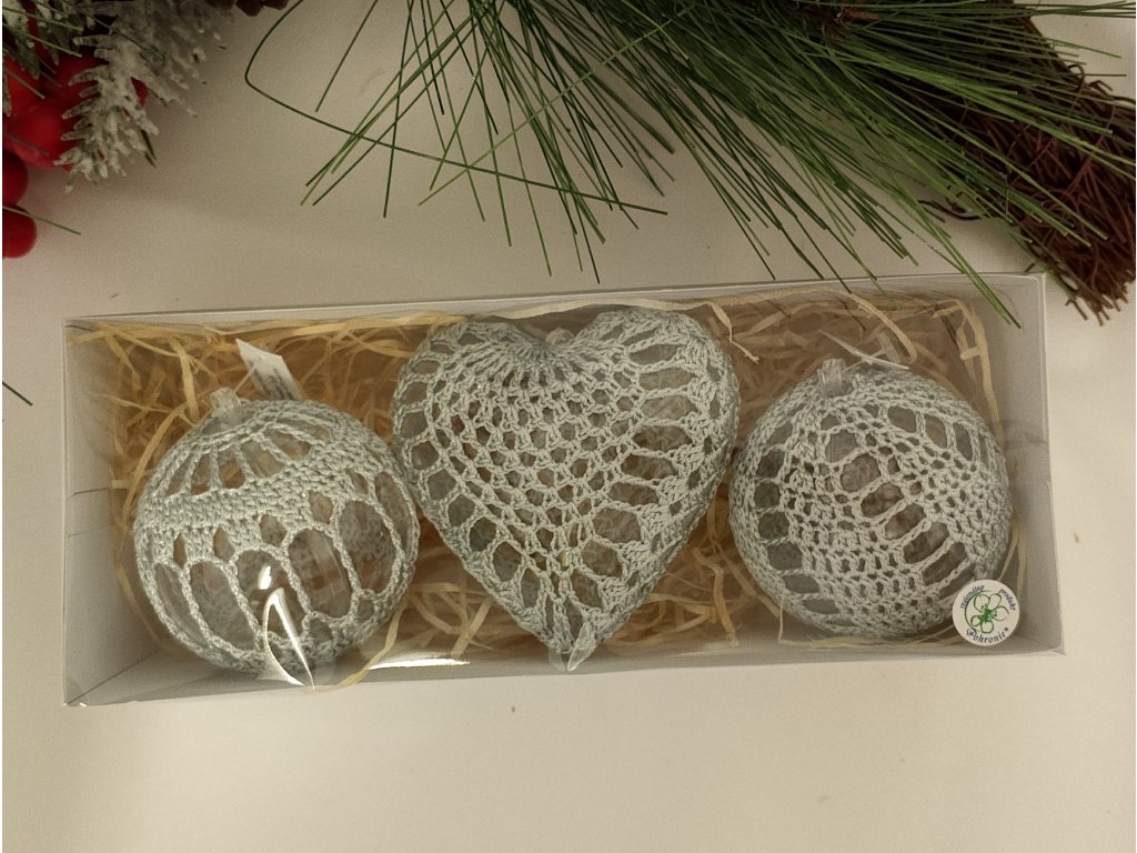 Set obsahuje 3 kusy háčkovaných ozdôb – jedno jemne vypracované srdiečko a dve elegantné guľky. Každá ozdoba je starostlivo a ručne háčkovaná s dôrazom na každý detail, čím sa zaručuje jedinečnosť každého kúsku.