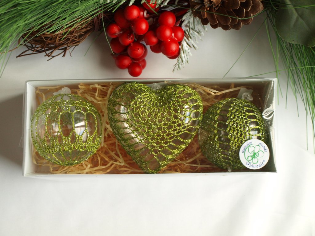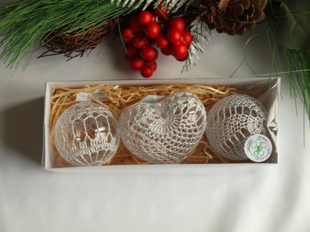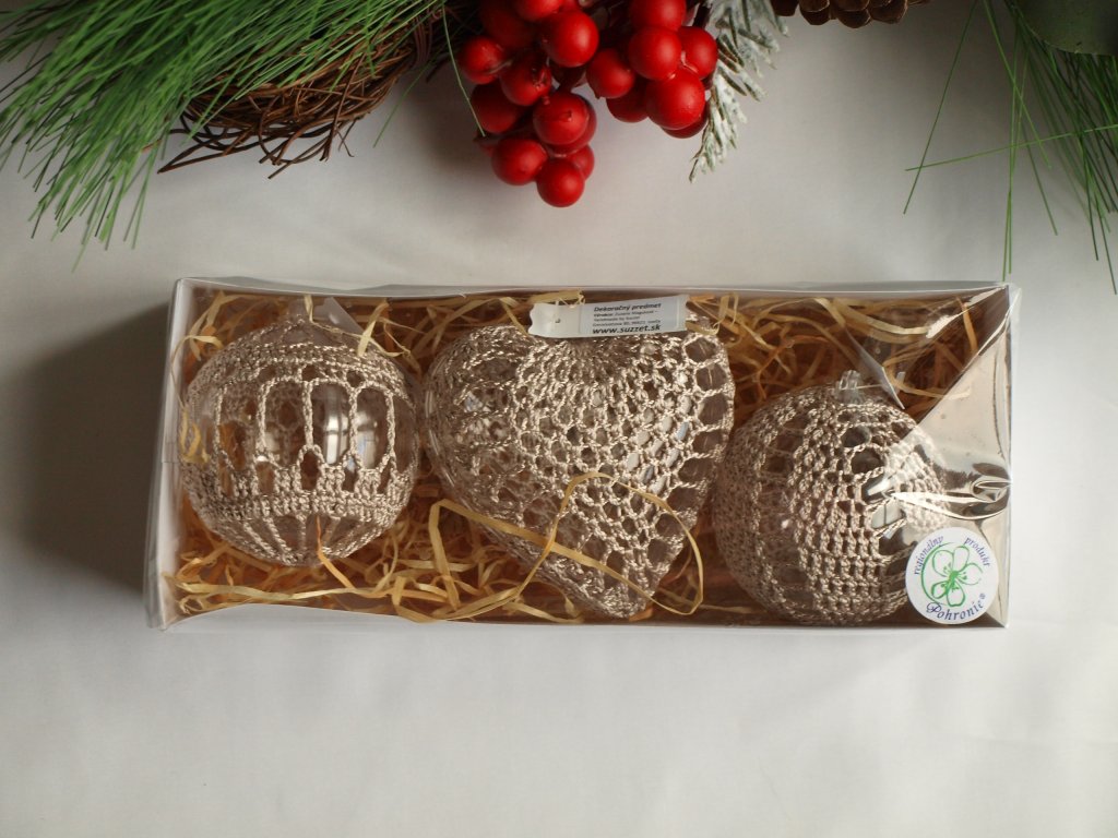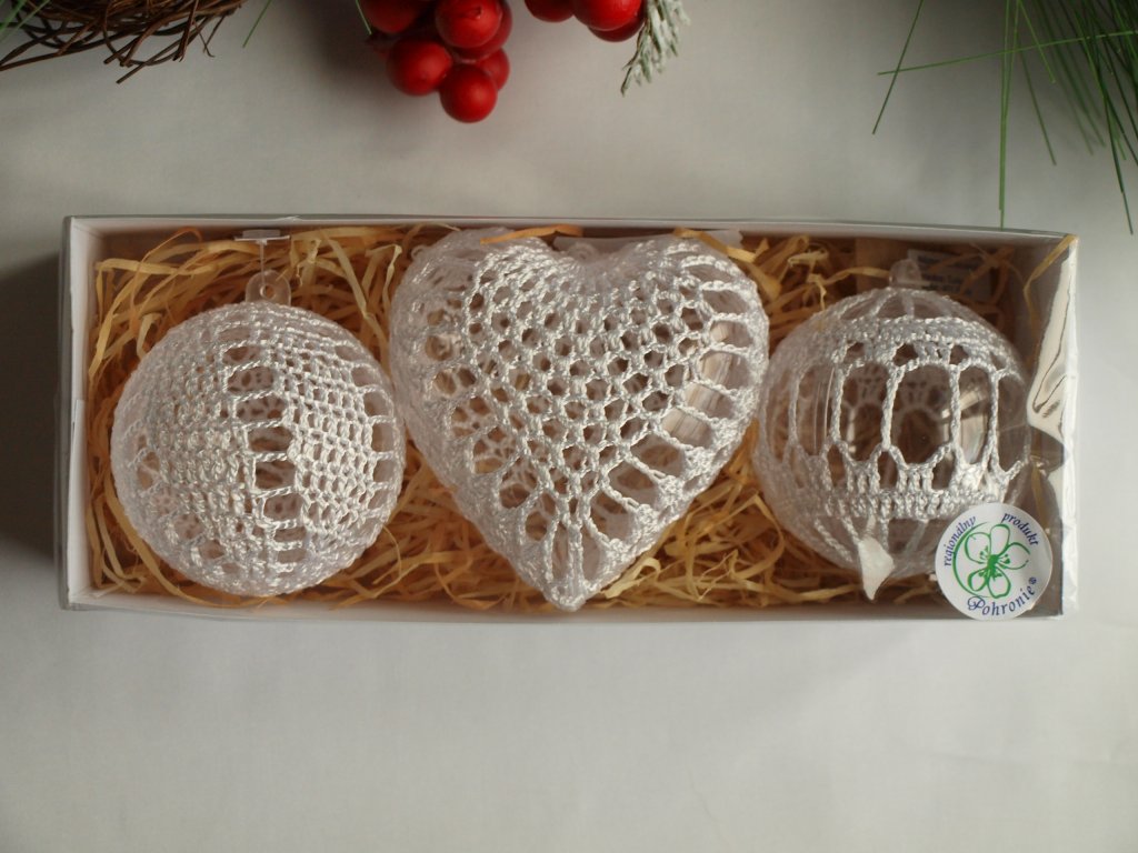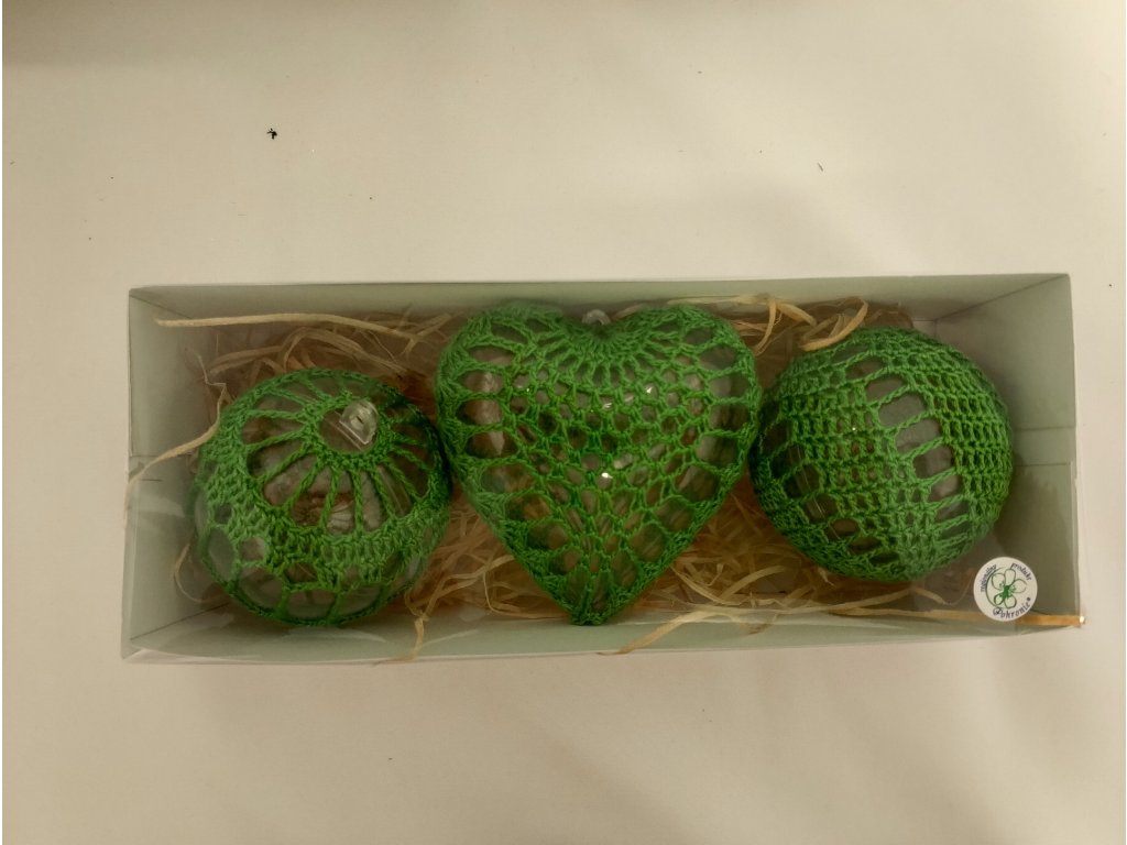 Set obsahuje 3 kusy háčkovaných ozdôb – jedno jemne vypracované srdiečko a dve elegantné guľky. Každá ozdoba je starostlivo a ručne háčkovaná s dôrazom na každý detail, čím sa zaručuje jedinečnosť každého kúsku.