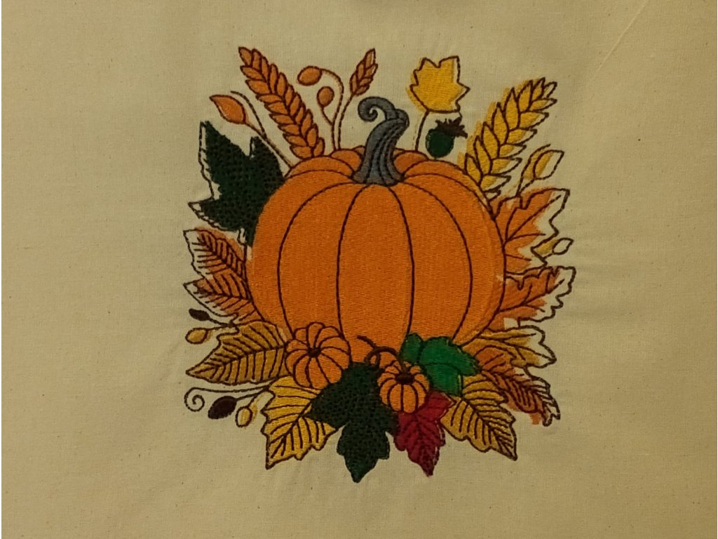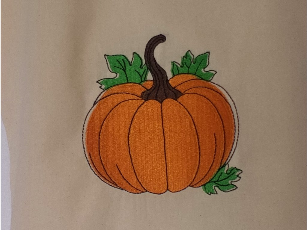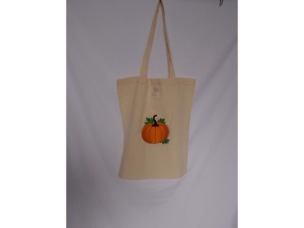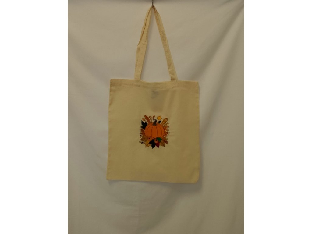 Farebné nite vytvárajú krásny kontrast so základnou farbou látky – ak je taška prírodne béžová alebo biela, tekvičky na nej žiaria ako drobné slnečné plody. Ak je podklad tmavší, oranžové a žlté tóny výšivky ešte viac vyniknú a dodajú taške živý charakter.