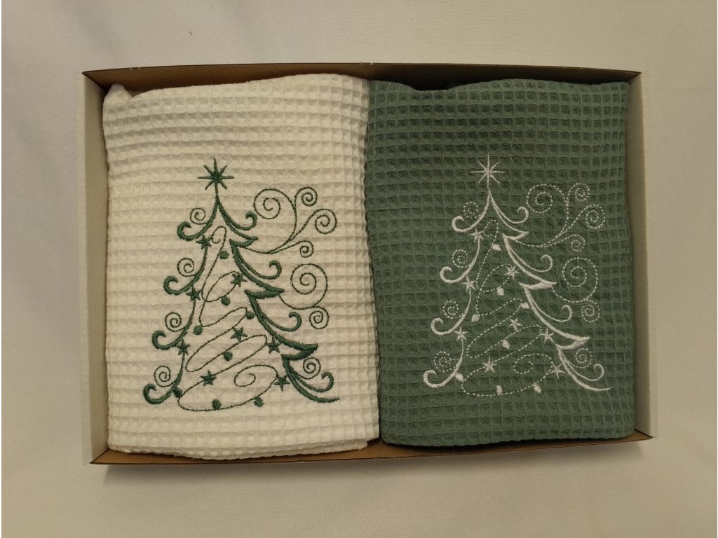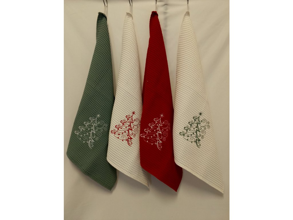 - Vianočné stromčeky: Bohato zdobené stromčeky s hviezdami, guľami a jemnými detailmi dodávajú utierkam sviatočný šmrnc.